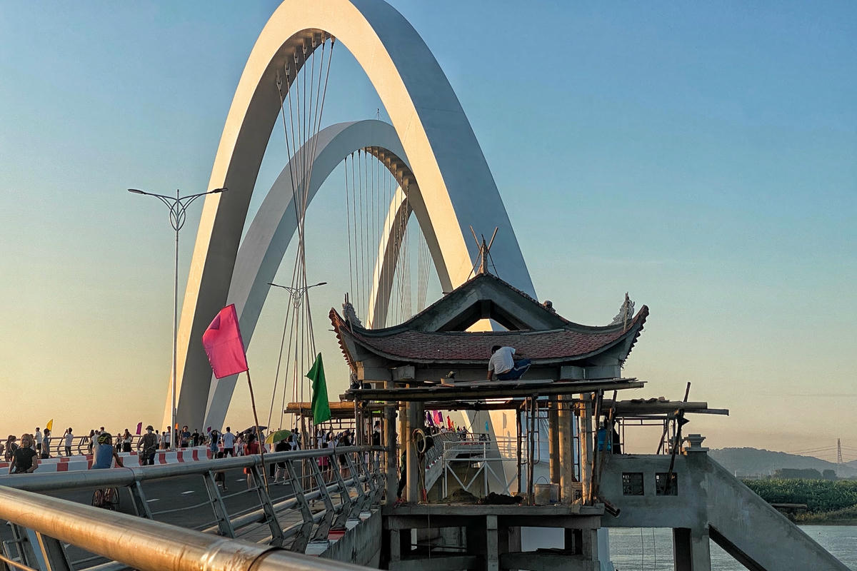 Sau hơn 5 năm thi công, cầu Phật Tích - Đại Đồng Thành có vòm thép cao nhất Việt Nam chuẩn bị thông xe. Hiện, một số hạng mục của cầu chưa hoàn thành nhưng nhiều người dân đã đến chụp ảnh; nhiều hàng quán ngang nhiên bày bán trên cầu.