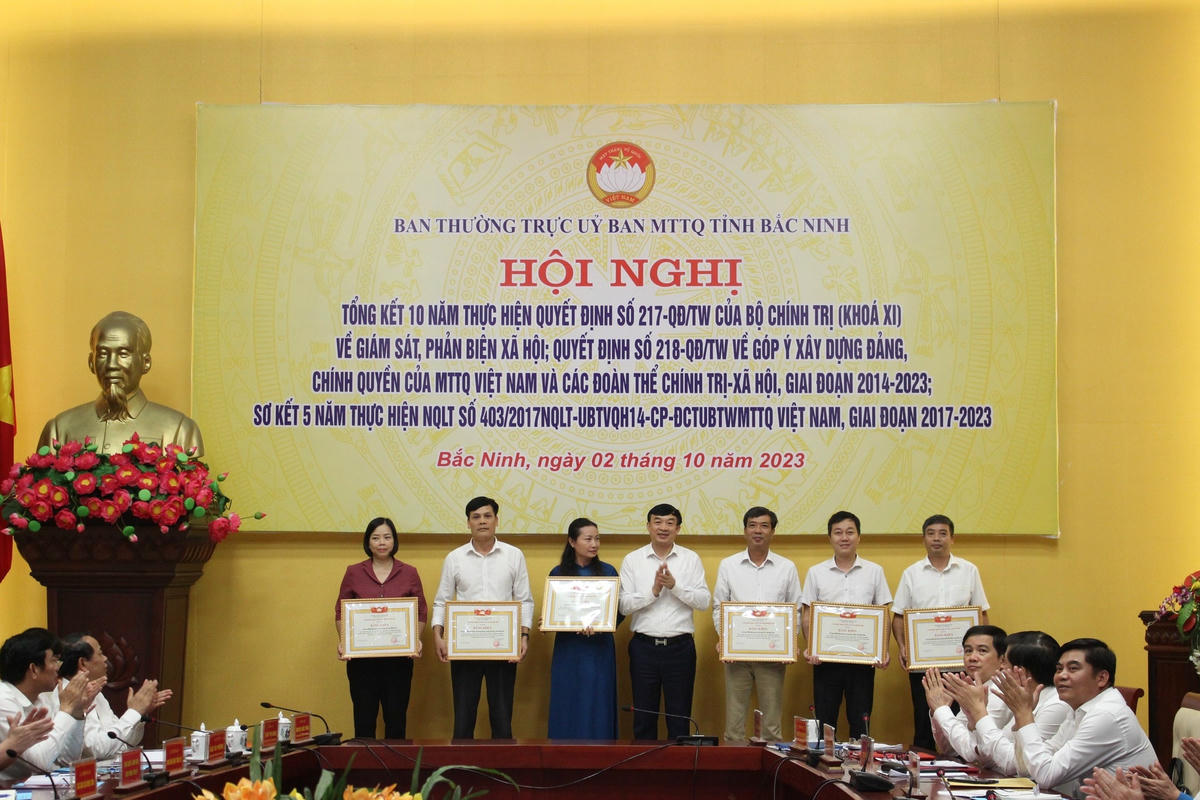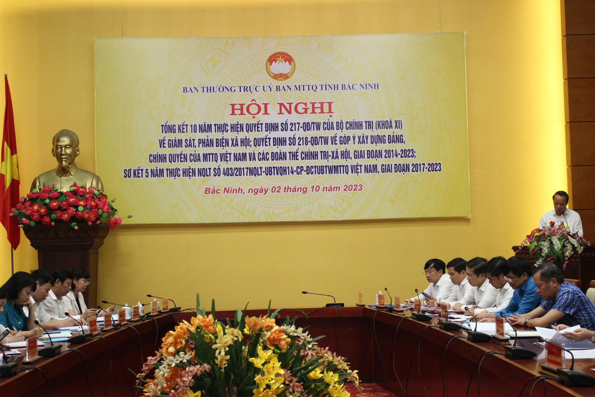 Ngày 2/10, Ban Thường trực Ủy ban MTTQ tỉnh Bắc Ninh tổ chức Hội nghị tổng kết 10 năm thực hiện Quyết định 217, Quyết định 218 của Bộ Chính trị (Khóa XI) về giám sát, phản biện xã hội, góp ý xây dựng Đảng, chính quyền của MTTQ Việt Nam và các đoàn thể chính trị - xã hội, giai đoạn 2014-2023; Sơ kết 5 năm thực hiện Nghị quyết Liên tịch số 403 quy định chi tiết hình thức giám sát, phản biện xã hội của MTTQ Việt Nam, giai đoạn 2017-2023.