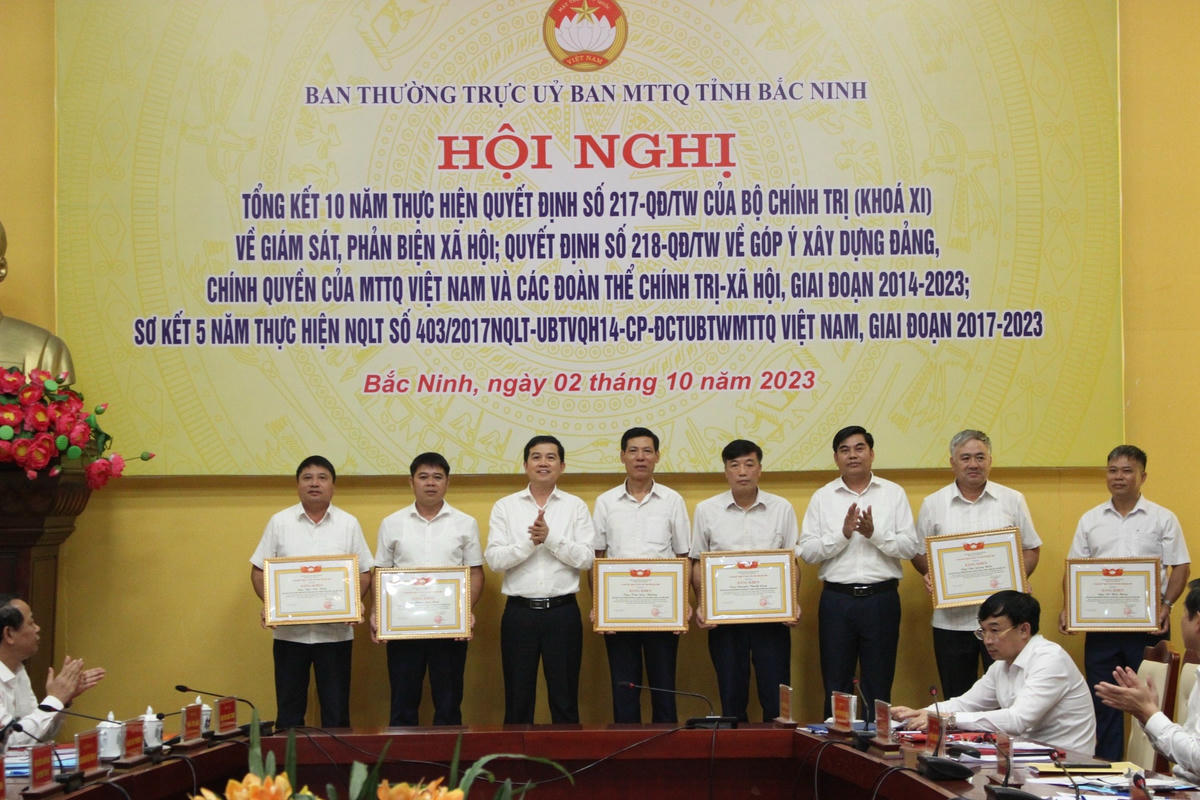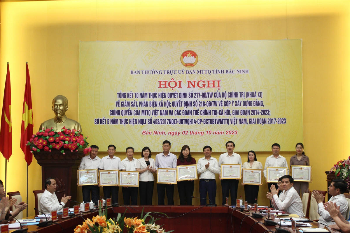 Tại Hội nghị, 10 tập thể, 10 cá nhân có thành tích xuất sắc được nhận Bằng khen của Chủ tịch UBND tỉnh Bắc Ninh; 6 tập thể, 12 cá nhân được nhận Bằng khen của Chủ tịch Ủy ban MTTQ tỉnh Bắc Ninh.