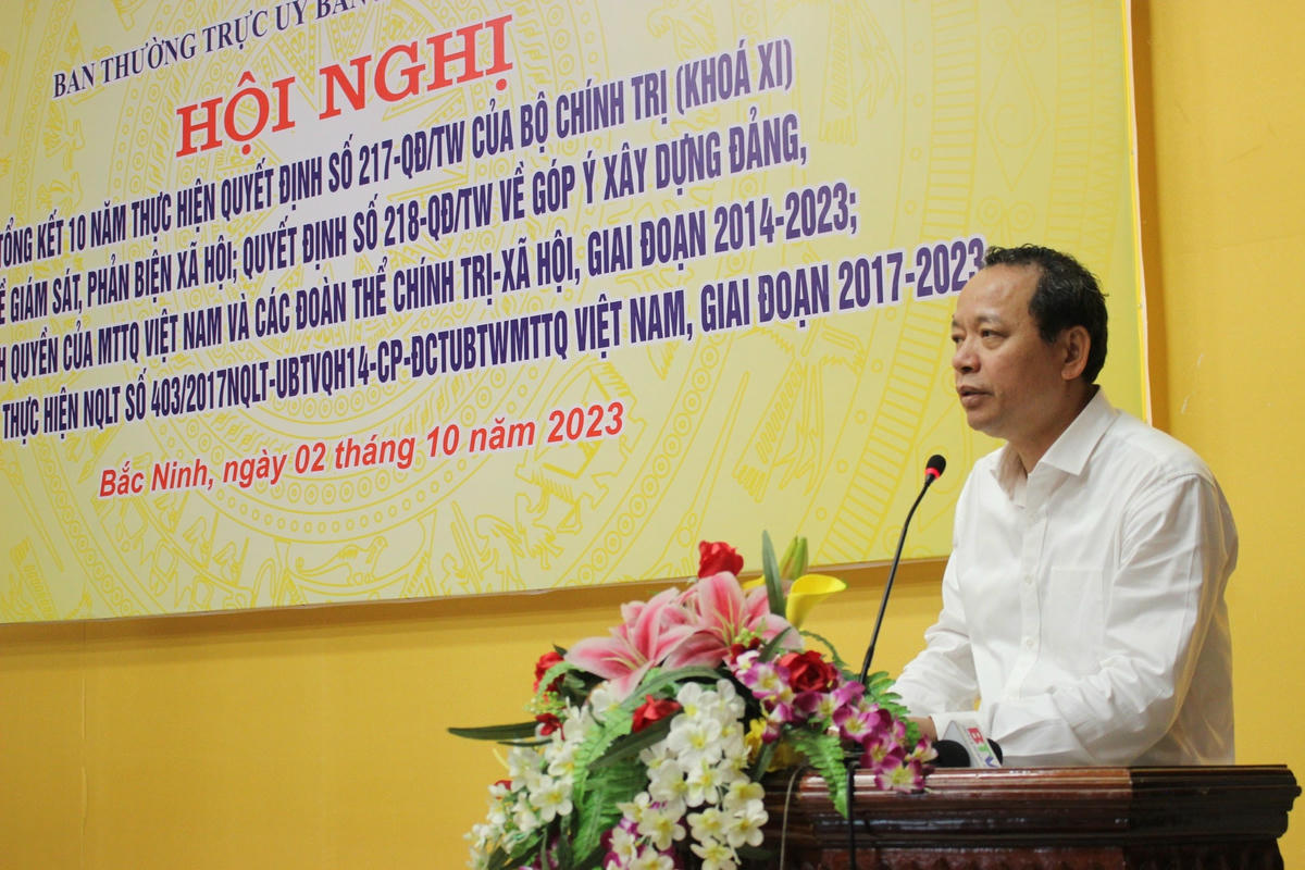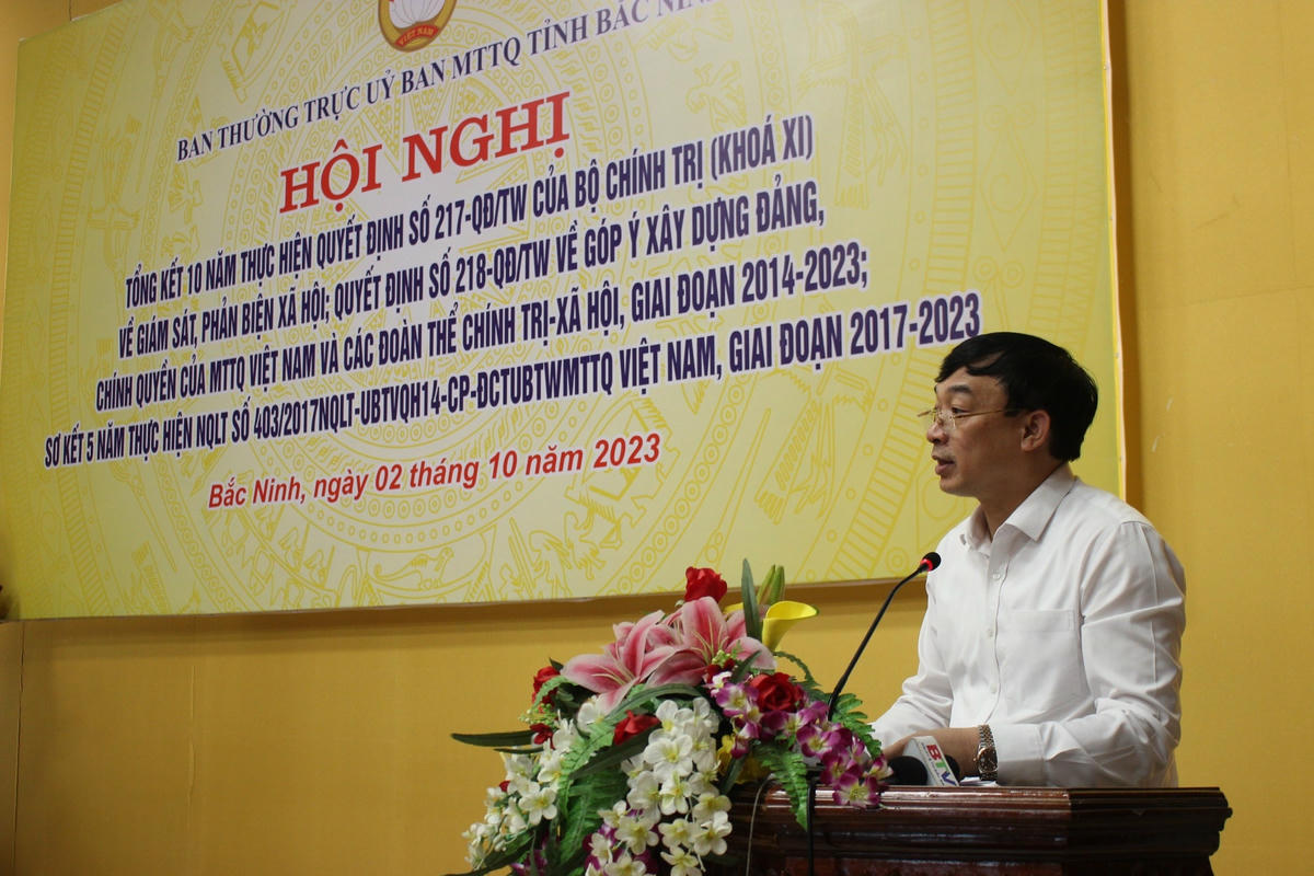 Phát biểu kết luận Hội nghị, Chủ tịch Ủy ban MTTQ tỉnh Bắc Ninh Nguyễn Đình Lợi nhấn mạnh, giám sát, phản biện xã hội, góp ý xây dựng Đảng, chính quyền của MTTQ Việt Nam, các tổ chức chính trị - xã hội có vai trò rất quan trọng trong việc phát huy dân chủ của nhân dân, góp phần xây dựng các chủ trương của Đảng, chính sách pháp luật của Nhà nước.