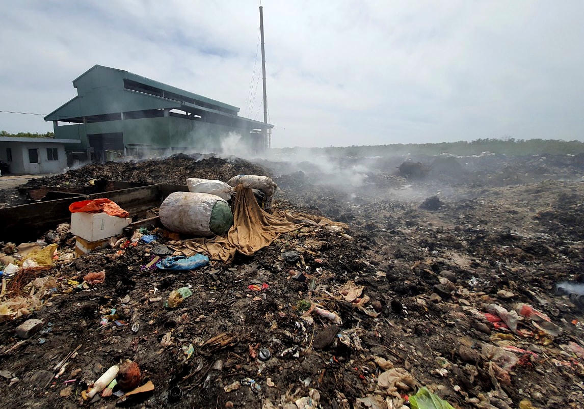 Chạy dọc con đường nhỏ, lối dẫn vào khu bãi rác thải khổng lồ ở ấp An Điền, xã Long Điền Tây, huyện Đông Hải, tỉnh Bạc Liêu, rác nằm ngổn ngang 2 bên đường, mùi hôi bốc lên nồng nặc. Bên trong, hàng chục tấn rác cao như núi, lửa khói nghi ngút, cộng thêm thời tiết những ngày qua nắng nóng khiến không khí trở nên ngột ngạt, khó thở.