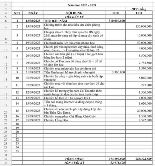 Còn các khoản chi: Mua đồ dùng cho học sinh, dụng cụ vệ sinh lớp học, mua quả cho học sinh tựu trường với số tiền 12.783.000 đồng, là các khoản chi phục vụ trực tiếp cho học sinh nên ban đại diện cha mẹ học sinh vẫn được tiếp tục thực hiện.