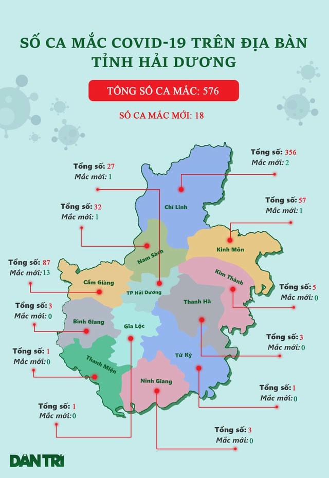 Trong ngày 18/2, trên địa bàn tỉnh Hải Dương ghi nhận 18 ca mắc Covid-19 mới, trong đó Cẩm Giàng 13 ca, Chí Linh 2, TP Hải Dương 1, Nam Sách 1, Kinh Môn 1. Hiện toàn tỉnh Hải Dương có 576 ca bệnh.