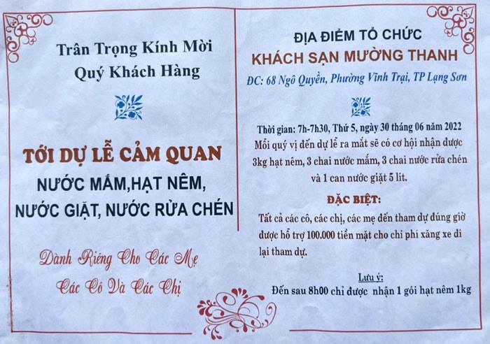 Để tạo sự tin tưởng và thúc đẩy người dân mua hàng, các đối tượng bán hàng đã áp dụng chiêu tặng quà là đường, mỳ chính, gạo, dầu ăn… cho tất cả khách mời tham dự "hội thảo" kể cả khi họ chưa mua sản phẩm chính. Sau đó, các đối tượng mới bắt đầu mời chào bán sản phẩm bằng những lời đường mật.