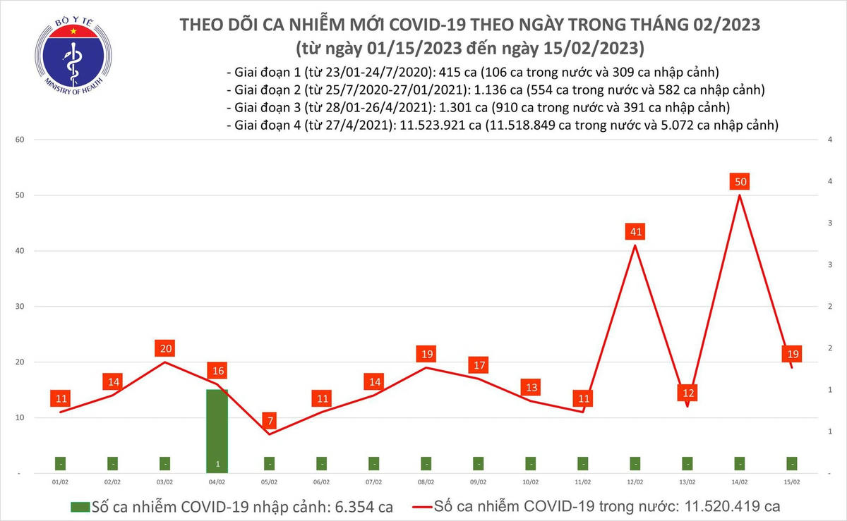 Bản tin phòng chống dịch Covid-19 ngày 15/2 của Bộ Y tế cho biết, có 19 ca mắc mới Covid-19, giảm mạnh so với hôm qua nhưng vẫn gấp gần 10 lần số khỏi bệnh.