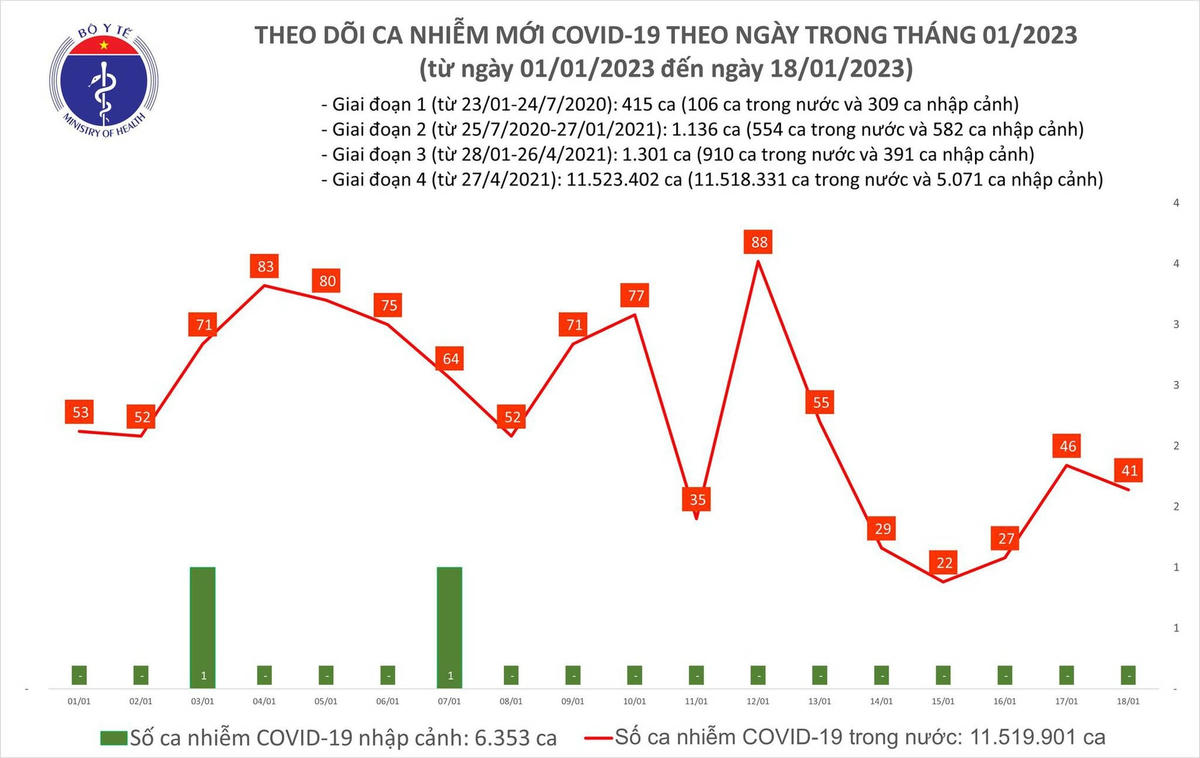 Bản tin phòng chống dịch Covid-19 ngày 18/1 của Bộ Y tế cho biết, có 41 ca mắc Covid-19, trong ngày tiếp tục không ghi nhận bệnh nhân Covid-19 tử vong, hiện chỉ còn 3 ca nặng đang thở oxy.