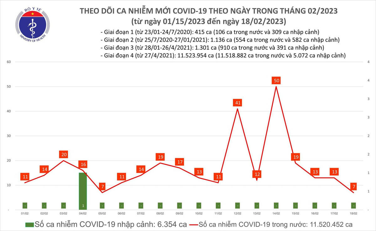 Bản tin phòng chống dịch Covid-19 ngày 18/2 của Bộ Y tế cho biết, có 7 ca mắc Covid-19, thấp nhất trong gần 2 tuần qua. Hiện có 6 bệnh nhân nặng đang điều trị.