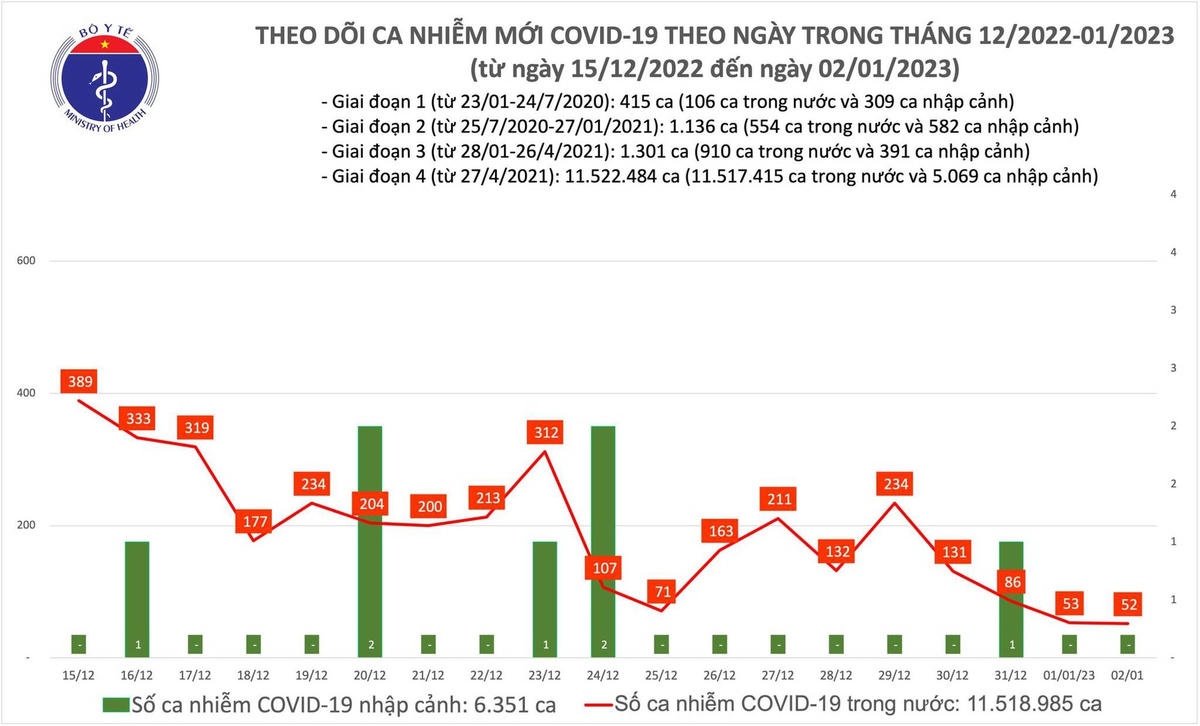 Bản tin phòng chống dịch Covid-19 ngày 2/1 của Bộ Y tế cho biết, có 52 ca mắc Covid-19, bệnh nhân nặng cũng giảm còn 12 ca đang thở máy và oxy. Hôm nay tiếp tục không ghi nhận ca tử vong do Covid-19.