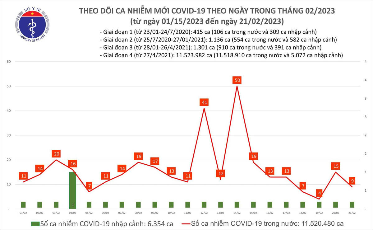 Bản tin phòng chống dịch Covid-19 ngày 21/2 của Bộ Y tế cho biết có 9 ca mắc Covid-19, giảm nhẹ so với hôm qua. Trong ngày có 6 bệnh nhân khỏi. Bệnh nhân nặng tăng lên 6 ca.