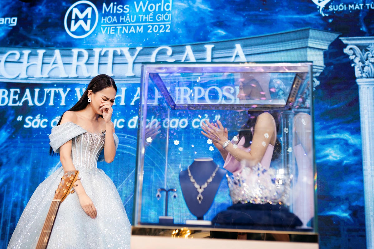 Đáng chú ý, trong khoảnh khắc đấu giá vương miện của Hoa hậu Mai Phương, bà Phạm Kim Dung, Chủ tịch Miss World Vietnam bất ngờ lên tiếng. Theo đó, bà bày tỏ mong muốn các mạnh thường quân ngừng việc đấu giá, nhường chiếc vương miện cho một mạnh thường quân giấu tên là bạn của mình với giá 3 tỷ đồng.