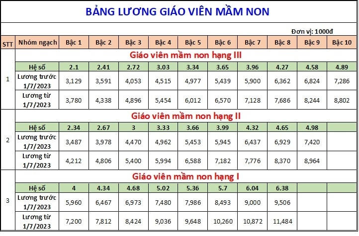 Bảng lương giáo viên từ ngày 1/7/2023 theo mức lương cơ sở 1,8 triệu đồng/tháng.
