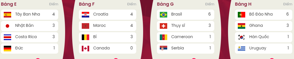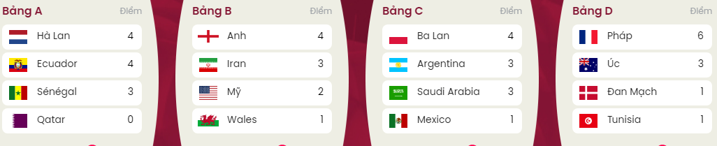 Bảng xếp hạng World Cup 2022 mới nhất diễn ra từ 20/11 đến 19/12 ở Qatar. Ba đội tuyển Pháp, Brasil và Bồ Đào Nha cùng 6 điểm và tiến thẳng vào vòng 1/8.