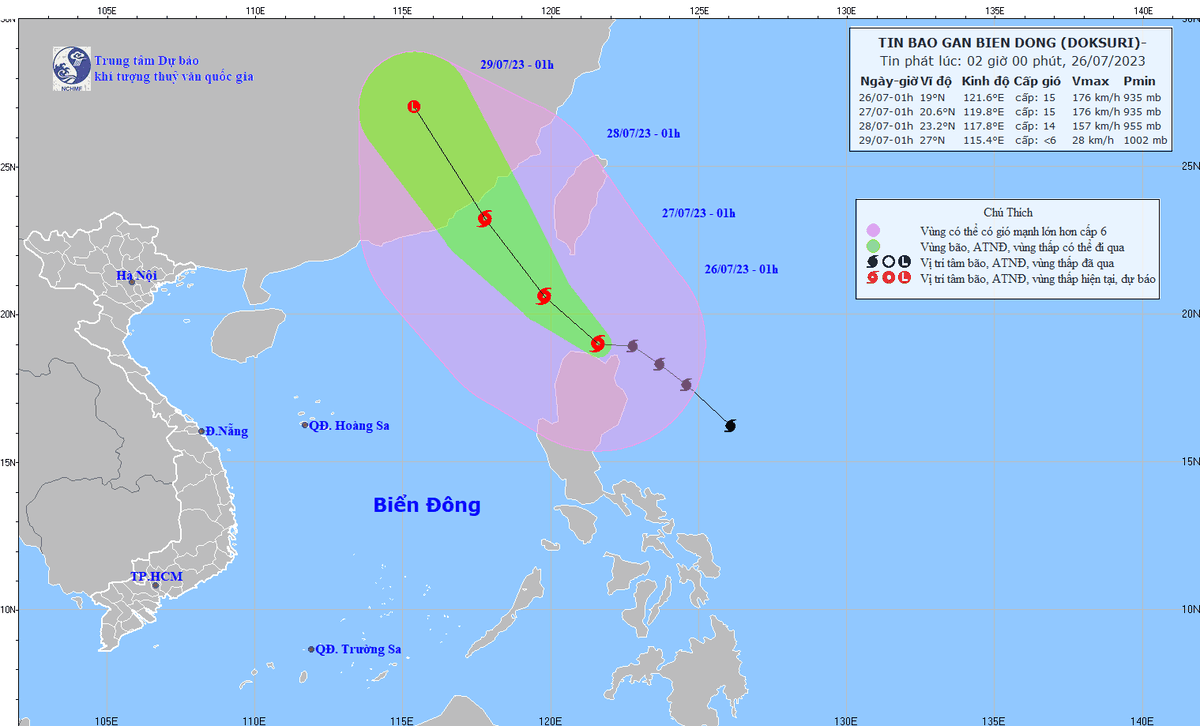 Theo Trung tâm Dự báo Khí tượng Thủy văn Quốc gia, hồi 1h ngày 26/7, vị trí tâm bão Doksuri ở vào khoảng 19,0 độ Vĩ Bắc; 121,6 độ Kinh Đông, trên vùng biển phía Đông Bắc đảo Lu-Dông (Philippines). Sức gió mạnh nhất vùng gần tâm bão mạnh cấp 15 (167-183km/giờ), giật trên cấp 17.