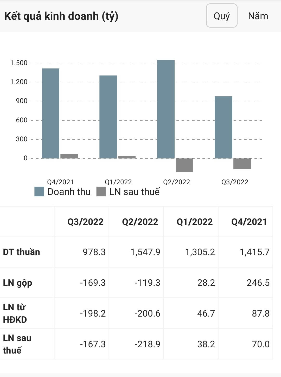 Về nguồn vốn, cũng tính đến cuối quý III/2022, vốn chủ sở hữu của doanh nghiệp giảm mạnh gần 1,2 lần so với con số đầu năm, xuống mức 1.810 tỷ đồng. Đáng chú ý, nợ dài hạn của doanh nghiệp tăng mạnh, gấp 5,8 lần con số đầu năm, lên mức 29 tỷ đồng.