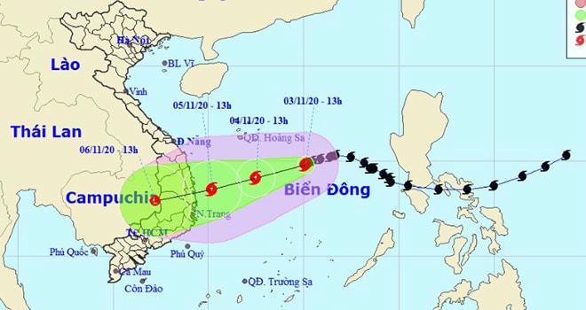 Bão số 10 (Goni) đang đổi hướng di chuyển và có diễn biến phức tạp trên Biển Đông, Trung tâm dự báo Khí tượng thủy văn Quốc gia dự báo, đến 13h ngày 5/11, vị trí tâm bão ở khoảng 13,5 độ Vĩ Bắc; 110,2 độ Kinh Đông, ngay trên vùng biển từ Quảng Ngãi đến Khánh Hòa. Sức gió mạnh nhất vùng gần tâm bão mạnh cấp 8 (60-75km/giờ), giật cấp 10.