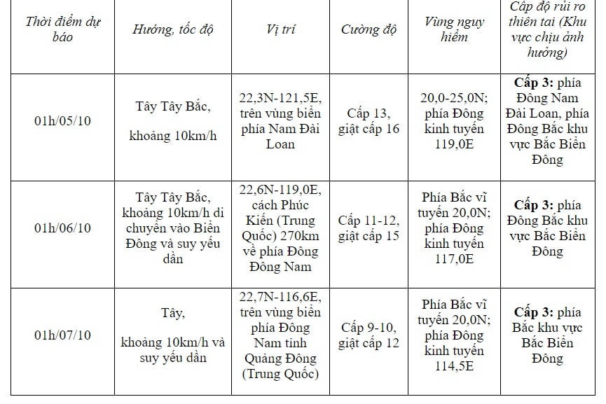 Dự báo tác động của bão: Vùng biển phía Đông Bắc của khu vực Bắc Biển Đông có gió mạnh cấp 6-7, từ đêm 4/10 mạnh lên cấp 8-10, vùng gần tâm bão đi qua cấp 11-12, giật cấp 15; biển động dữ dội. Vùng biển phía Đông Bắc của khu vực Bắc Biển Đông sóng biển cao 2,0-4,0m; từ đêm 04/10, sóng biển cao 4,0-6,0m, vùng gần tâm bão sóng cao 6,0-8,0m.