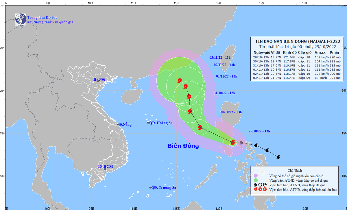 Trung tâm Dự báo khí tượng thủy văn quốc gia cho biết: Hồi 13h ngày 29/10, vị trí tâm bão Nalgae ở vào khoảng 13,9 độ Vĩ Bắc; 121,6 độ Kinh Đông, trên khu vực miền Trung Philippin. Sức gió mạnh nhất vùng gần tâm bão mạnh cấp 10 (89 - 102 km/giờ), giật cấp 12.