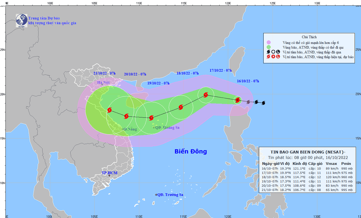 Trung tâm Dự báo khí tượng thủy văn quốc gia thông tin, sáng 16/10, bão Nesat cường độ đã mạnh lên cấp 11, giật cấp 12. Dự báo, trong 24 giờ tới, bão sẽ đi vào Biển Đông với cường độ dự báo cấp 11, giật cấp 13.