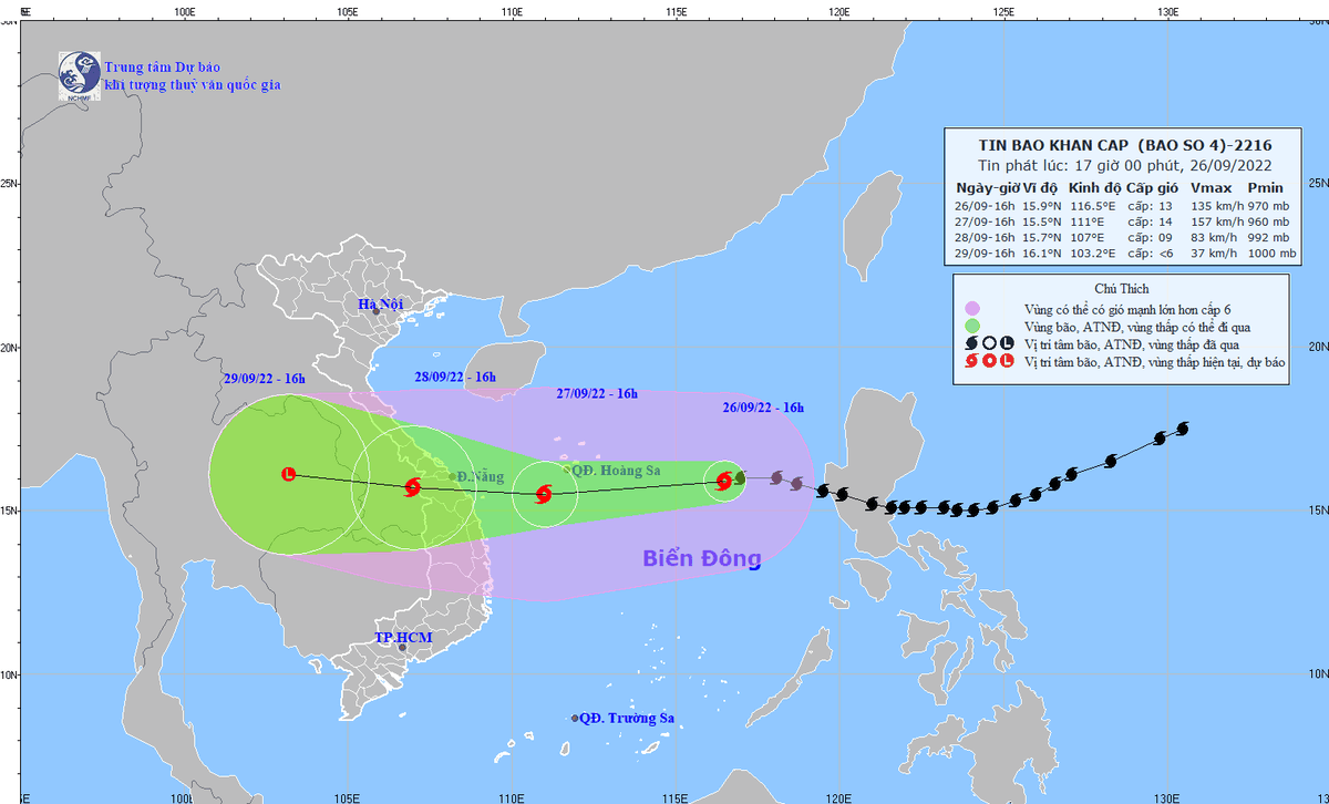 Bản tin từ Trung tâm Dự báo Khí tượng thủy văn quốc gia chiều 26/9 cho biết: 16h ngày 26/9, vị trí tâm bão ở khoảng 15,9 độ Vĩ Bắc; 116,5 độ Kinh Đông, trên vùng biển phía Đông khu vực Bắc và Giữa Biển Đông, cách quần đảo Hoàng Sa khoảng 580 km về phía Đông. Sức gió mạnh nhất vùng gần tâm bão mạnh cấp 12-13 (118-149 km/giờ), giật cấp 15. Bán kính gió mạnh từ cấp 6, giật từ cấp 8 trở lên khoảng 230 km tính từ tâm bão; bán kính gió mạnh từ cấp 10, giật từ cấp 12 trở lên khoảng 100 km tính từ tâm bão.
