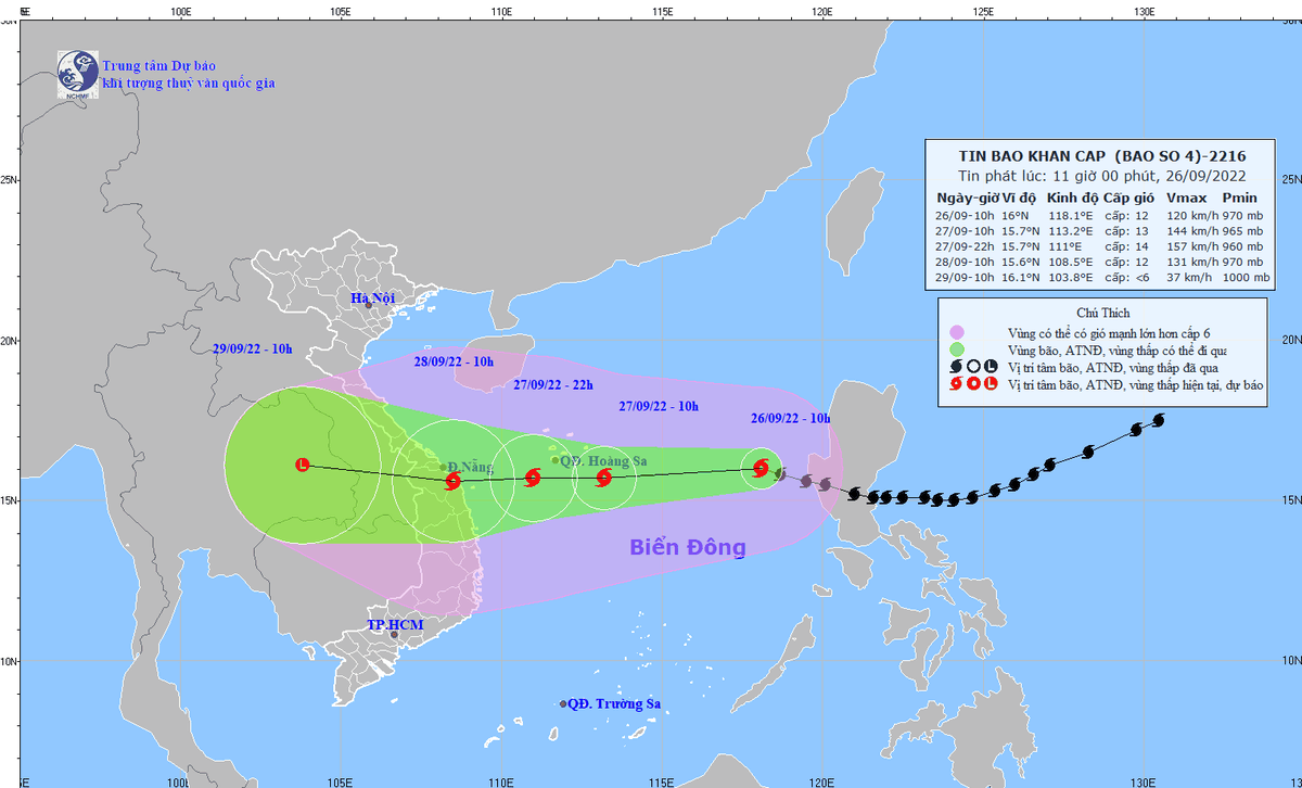 Theo Trung tâm Dự báo khí tượng thủy văn quốc gia, hồi 10h ngày 26/9, vị trí tâm bão ở khoảng 16 độ Vĩ Bắc; 118,1 độ Kinh Đông, trên vùng biển phía Đông khu vực Bắc và giữa Biển Đông, cách quần đảo Hoàng Sa khoảng 650 km về phía Đông. Sức gió mạnh nhất vùng gần tâm bão mạnh cấp 12 (118 - 133 km/giờ), giật cấp 14. Bán kính gió mạnh từ cấp 6, giật từ cấp 8 trở lên khoảng 210 km tính từ tâm bão; bán kính gió mạnh từ cấp 10, giật từ cấp 12 trở lên khoảng 100 km tính từ tâm bão.