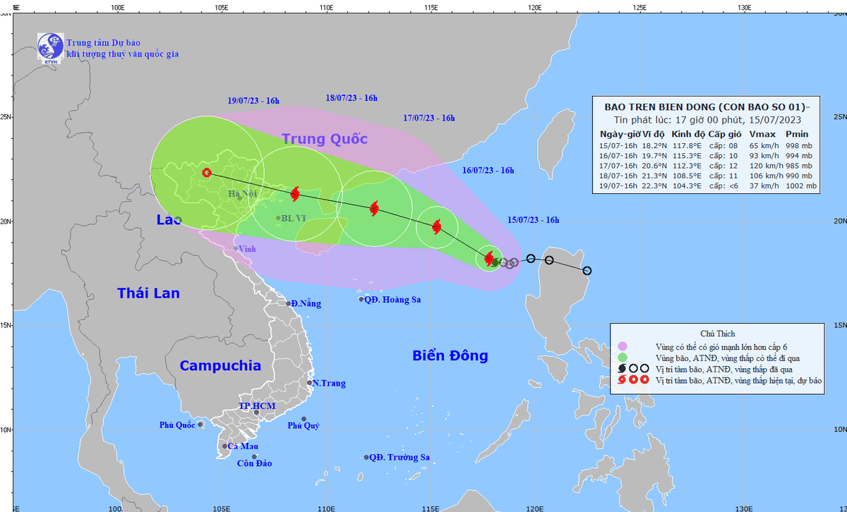Bản tin mới nhất về cơn bão số 1 năm 2023 trên Biển Đông vừa được Trung tâm Dự báo khí tượng thủy văn phát đi lúc 17h chiều nay 15/7.