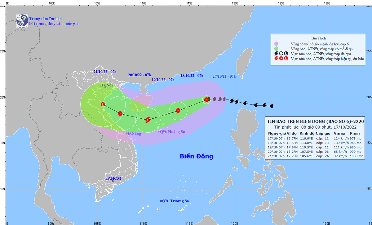 Bản tin dự báo về bão số 6 từ Trung tâm Dự báo Khí tượng thủy văn quốc gia cho biết, sáng 17/10, tâm bão số 6 còn cách quần đảo Hoàng Sa khoảng 600 km về phía Đông Bắc.