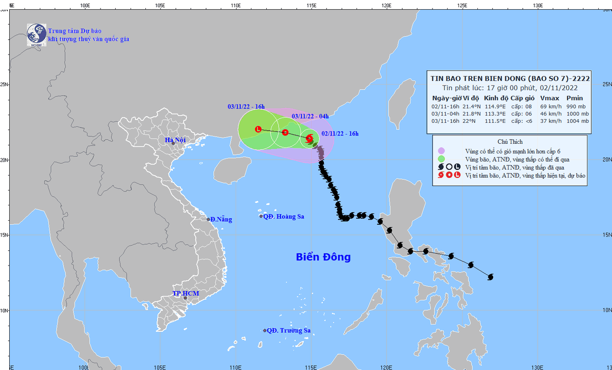 Trung tâm Dự báo Khí tượng thủy văn quốc gia cho biết, 16h ngày 2/11, vị trí tâm bão số 7 ở vào khoảng 21,4 độ Vĩ Bắc; 114,9 độ Kinh Đông, cách Hồng Kông (Trung Quốc) khoảng 130 km về phía Nam Đông Nam.