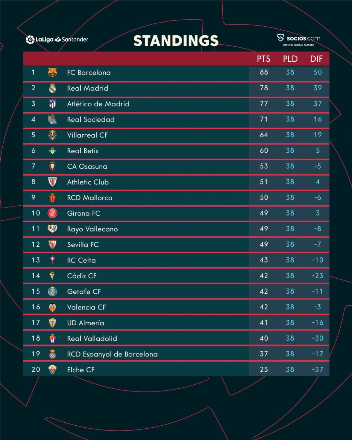 Real Madrid chính thức khép lại mùa giải với ngôi Á quân La Liga (78 điểm/38 trận). Sau mùa giải này, đoàn quân HLV Ancelotti sẽ thay máu lực lượng mạnh mẽ khi Asensio, Benzema và Eden Hazard ra đi.