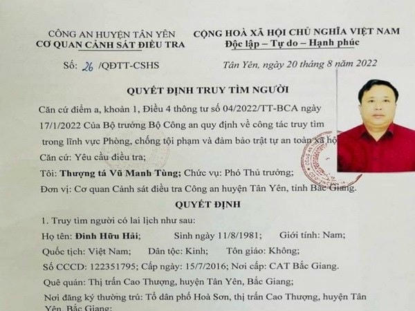 Theo Công an tỉnh Bắc Giang, lúc 11h40 ngày 21/8, Công an huyện Tân Yên phối hợp với Phòng Cảnh sát hình sự đã bắt giữ đối tượng có hành vi giết người Đinh Hữu Hải khi đang lẩn trốn tại nhà nghỉ Phương Nam 2 thuộc thôn Kim Tràng, xã Việt Lập, huyện Tân Yên, tỉnh Bắc Giang.