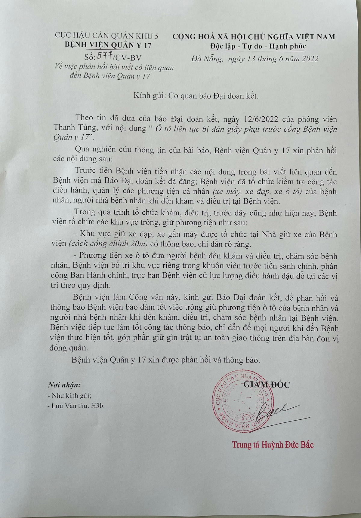 Ngày 13/6, Trung tá Huỳnh Đức Bắc, Giám đốc Bệnh viện Quân y 17 có văn bản phản hồi. Văn bản cho biết, bệnh viện đã tổ chức tốt trông giữ ô tô cho bệnh nhân và người dân tại khuôn viên trước tiền sảnh chính.