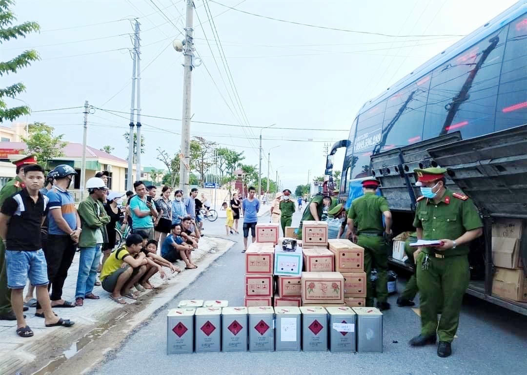 Công an huyện Can Lộc (tỉnh Hà Tĩnh) vừa cưỡng chế một xe ô tô khách vì không chấp hành hiệu lệnh của lực lượng chức năng, đồng thời tạm giữ một số lượng lớn hàng hoá để xác minh nguồn gốc xuất xứ.