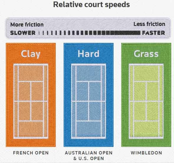 Đất sét, có bề mặt lỏng lẻo hơn, tạo ra nhiều ma sát hơn cho quả bóng khi nó chạm vào, khiến độ nảy cao hơn, giúp quả bóng chậm lại một cách hiệu quả. Sân cứng là điểm tựa của bộ ba, mang lại tốc độ trung bình và độ nảy trung tính hơn.