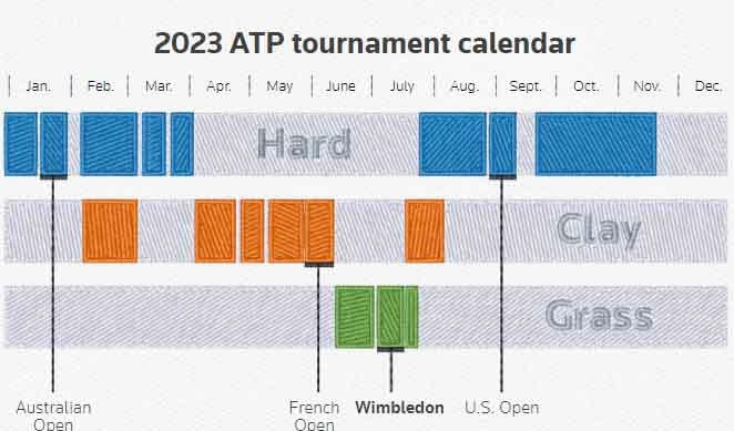 Mùa giải quần vợt trên sân cỏ trong giải đấu của Hiệp hội Quần vợt Chuyên nghiệp (ATP) diễn ra trong thời gian ngắn trong suốt những tháng mùa hè, với điểm nhấn là giải Wimbledon. Giải đấu cuối cùng trước khi mùa giải sân cỏ bắt đầu là giải Pháp mở rộng, đỉnh cao của quần vợt sân đất nện.