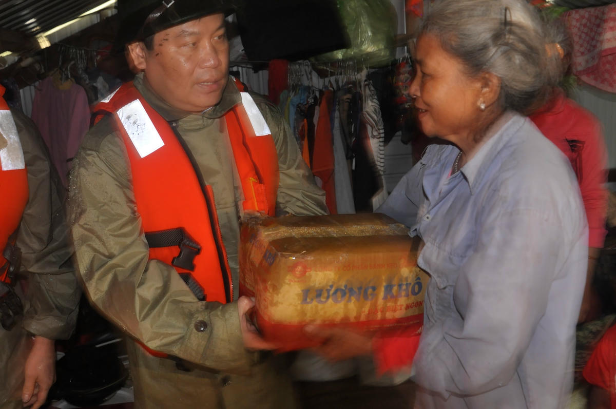 Để động viên và chia sẻ khó khăn với người dân xã Tân Hóa đang ứng phó với lũ lụt, Bí thư Tỉnh ủy Quảng Bình Vũ Đại Thắng cùng đoàn đã đi ca nô, thuyền nhôm đến từng nhà bè để trao tặng lương khô, mì tôm và nước suối cho người dân.