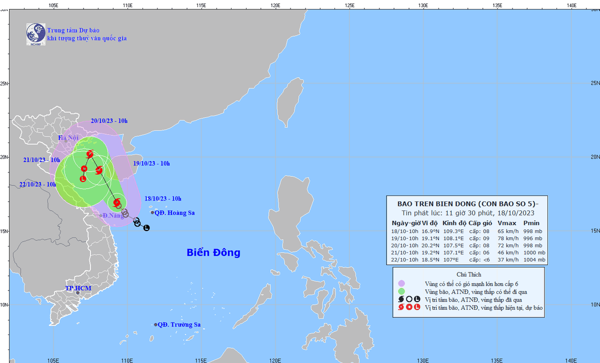 Hồi 11h, vị trí tâm bão ở vào khoảng 16,9 độ Vĩ Bắc; 109,3 độ Kinh Đông, cách quần đảo Hoàng Sa khoảng 270km về phía Tây Tây Bắc, cách đất liền khu vực Quảng Trị - Quảng Ngãi khoảng 150km về phía Đông. Sức gió mạnh nhất vùng gần tâm bão mạnh cấp 8 (62-74km/giờ), giật cấp 11. Di chuyển theo hướng Bắc Tây Bắc với tốc độ khoảng 10km/h.