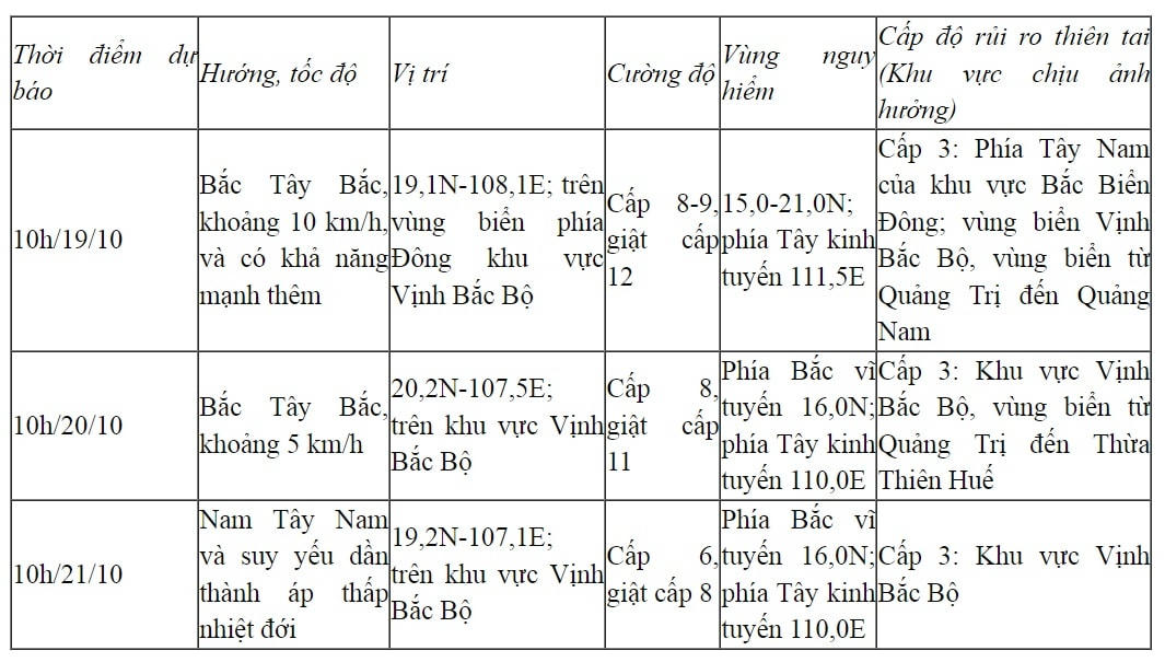 Vùng biển phía Tây Nam của khu vực Bắc Biển Đông (bao gồm cả vùng biển quần đảo Hoàng Sa), vùng biển từ Quảng Trị đến Quảng Ngãi sóng biển cao 2,0-4,0m, vùng biển Vịnh Bắc Bộ từ gần sáng và ngày 19/10 sóng biển tăng cao 2,0-4,0m, sau tăng lên 3,0-5,0m.