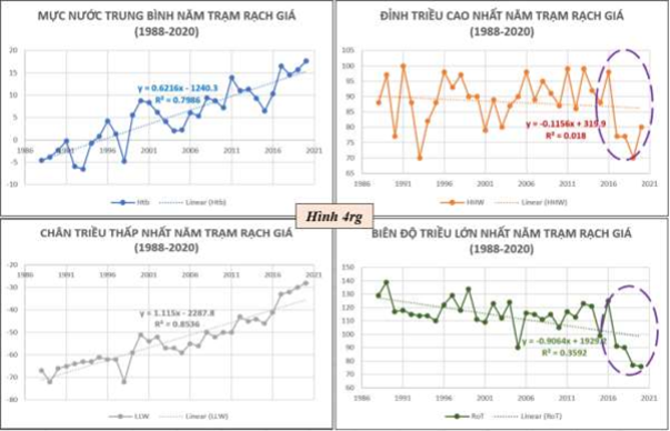 Như đã nhận xét trong (3), đỉnh triều cao nhất năm, chân triều thấp nhất năm trong 33 năm tại Xẻo Rô và Rạch Giá có xu hướng tuyến tính tăng với hệ số R2từ 0.4883 đến 0.853, trừ đỉnh triều cao nhất năm tại Rạch Giá là rất biến động. xu hướng không rõ, R2= 0.018 (Hình 4rg).
