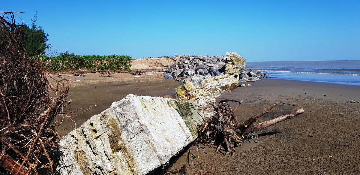 Dẫn tôi ra phía bờ biển, nơi có những mảng tường, móng nhà kiên cố bằng bê tông đã bị sóng biển làm cho đứt gãy, sụp đổ và những gốc phi lao trơ rễ, bà Hương không giấu được sự xót xa: Chỉ khoảng dăm năm về trước, bờ biển còn là bãi cát dài hàng trăm mét với rừng phi lao như những người bảo vệ, đứng hiên ngang chắn sóng, gió. Nhưng sóng biển như loài gặm nhấm khổng lồ, mỗi ngày lấy đi một ít. Tình trạng xâm thực vẫn diễn ra, tuy nhiên qua mùa mưa, bão, cát lại bồi về đầy như cũ.