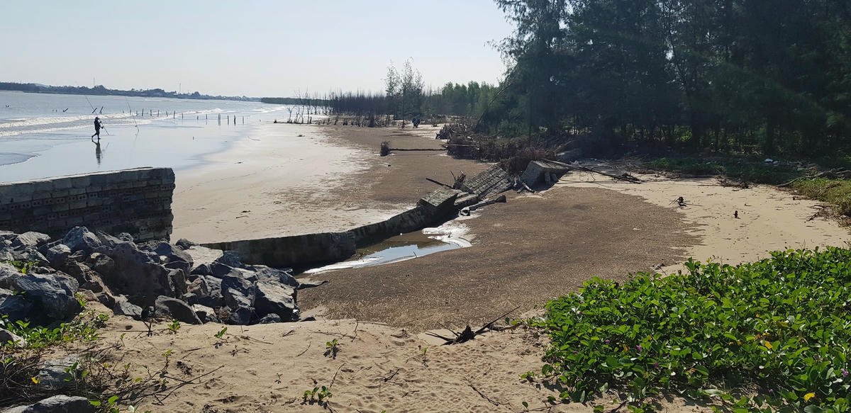 “Các chú làm sao lên tiếng giúp bà con, chứ để vậy không ổn, sóng cuốn mất cả rồi” - Tiếng một người phụ nữ khác thảng thốt cất lên chen ngang câu chuyện. Người phụ nữ mới đến cởi chiếc nón mê tả tơi để lộ mái tóc hoa râm và khuôn mặt khắc khổ màu cháy nắng khó đoán tuổi. Bà cũng tên Hương - Hoàng Thị Hương, người cùng thôn. Rồi như sợ chúng tôi cũng sẽ biến mất, bà kể vội vã: Trước, gia đình bà có 1.250m2 đất ở ngay khu vực ven biển xâm thực. Tuy nhiên, diện tích đất này đang bị sóng biển khoét sâu, ăn mòn dần. Quá lo lắng trước tình hình biển ngày càng xâm thực mạnh, trong năm 2022, đã 3 lần gia đình nhà bà Hương phải bỏ ra gần 400 triệu đồng xây tường bao, be bờ, đổ cát, đá, làm kè, giằng, đổ cột bê tông kiên cố để giữ đất nhưng tình trạng vẫn không được cải thiện là mấy. Sau cơn bão số 4 vừa qua, nhiều đoạn tường bao bê tông đã bị sóng đánh đứt gãy và phân nửa đã bị chìm vào lòng biển. "Nhà có 6 khẩu, không nghề phụ, chúng tôi đã mua mảnh đất này dự định để cho con cái làm ăn, phát triển du lịch, nhưng với tình trạng như thế này thì chả mấy sẽ mất hết đất. Chúng tôi mong nhà nước sớm có biện pháp kè chắn để ngăn chặn sự xâm thực và đảm bảo an toàn cho người dân" - bà Hoàng Thị Hương bày tỏ.