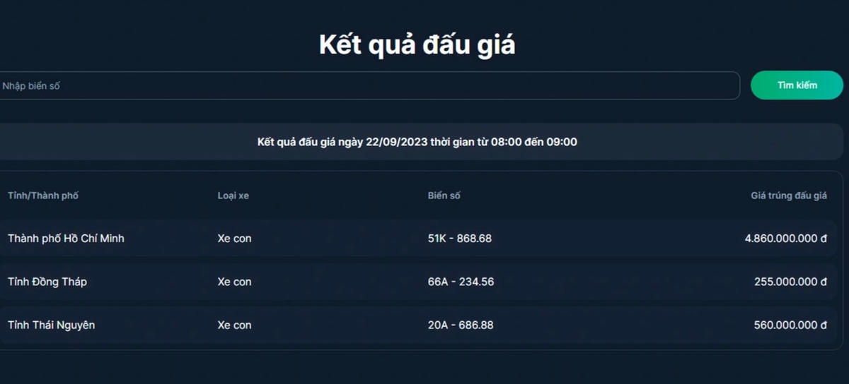 3 biển số ô tô được đưa ra đấu giá trong phiên đấu giá từ 9h15 đến 10h15 ngày 22/9 gồm: 61K-268.68 trúng đấu giá với số tiền hơn 1,1 tỷ đồng, 35A-366.66 trúng đấu giá với số tiền 545 triệu đồng, 99A-668.68 trúng đấu giá với số tiền 545 triệu đồng.