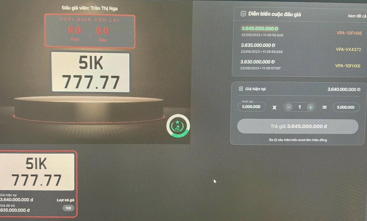 Tại phiên đấu giá cuối cùng sáng 22/9, biển số 51K-777.77 đã có chủ nhân chi 3,64 tỷ đồng để sở hữu.