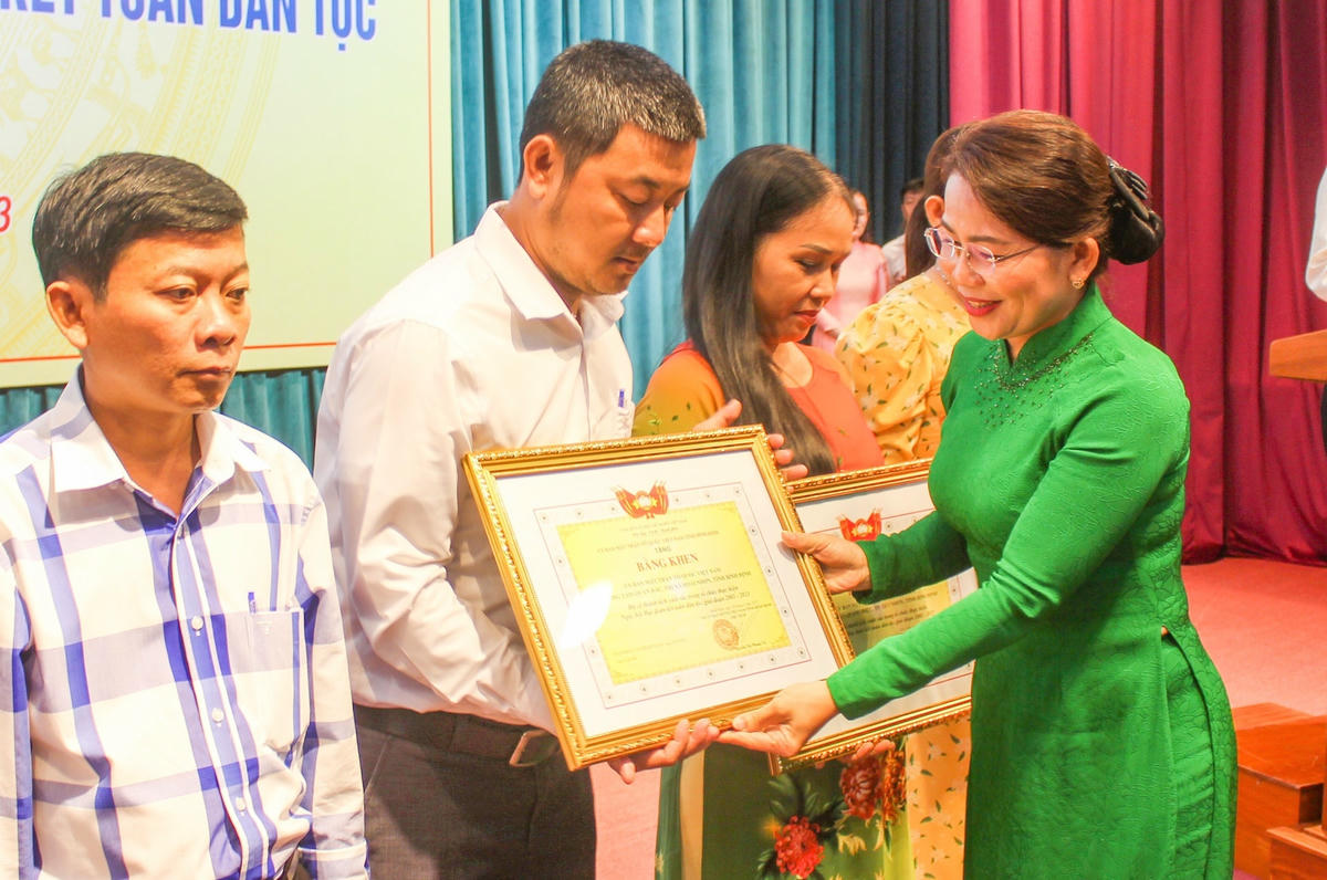 Nhân dịp này, Hội nghị cũng đã biểu dương và khen thưởng cho 40 tập thể và 22 cá nhân đã có thành tích xuất sắc trong việc tổ chức Ngày Hội đại đoàn kết toàn dân tộc giai đoạn 2003 – 2023, đồng thời, xét đề nghị Ủy ban Trung ương MTTQ Việt Nam tặng bằng khen cho 3 tập thể KDC và Ban Công tác Mặt trận.