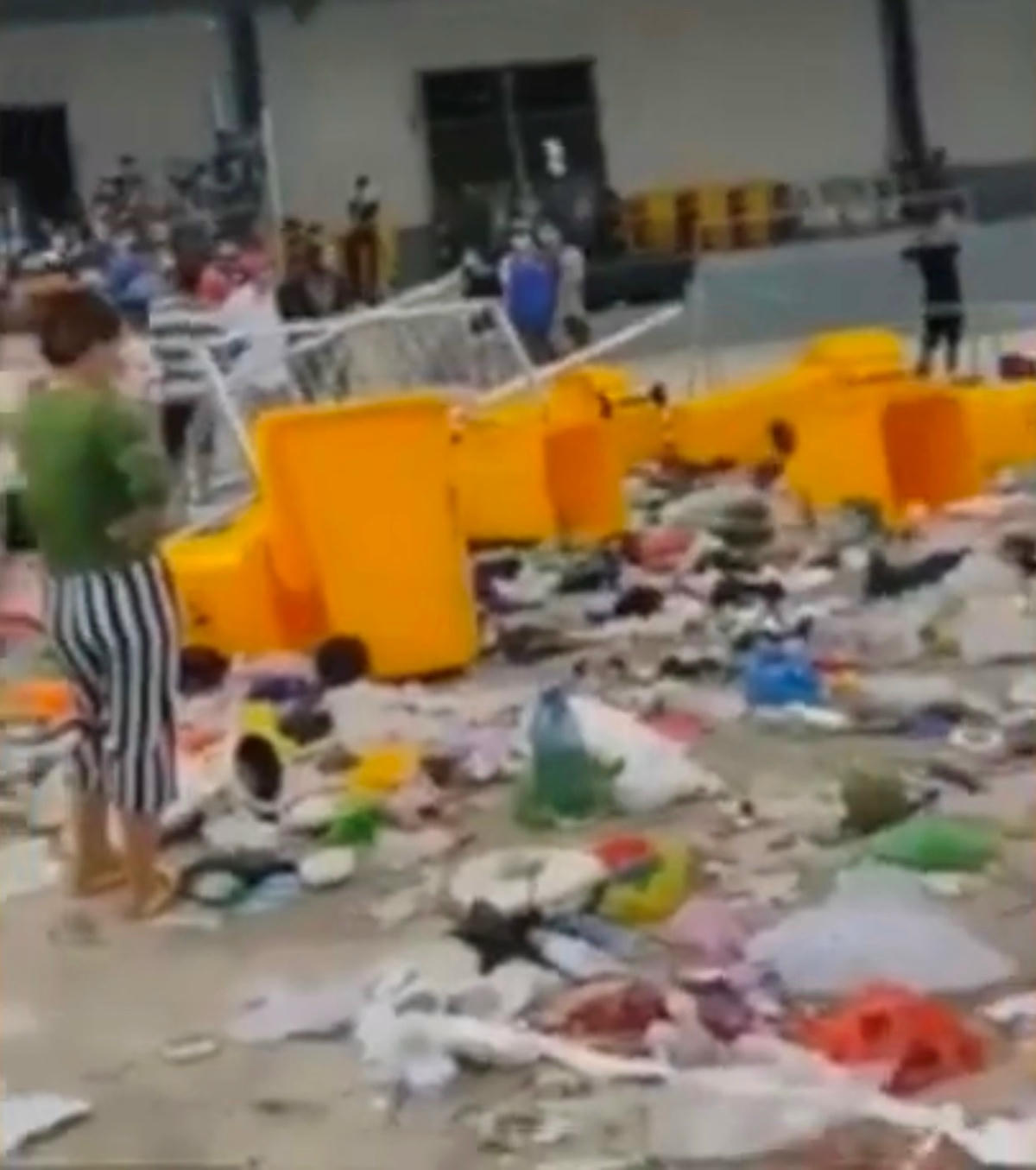 Trước đó, tối ngày 3/9, mạng xã hội xuất hiện một clip ghi lại cảnh nhân viên mặc đồ bảo hộ đẩy xe thức ăn vào bên trong khu điều trị thì hàng trăm F0 ùa ra chặn đường, xô đổ hàng rào để lấy thức ăn. Nhiều người lấy 5-10 phần, trong khi nhiều người khác không có phần nào.