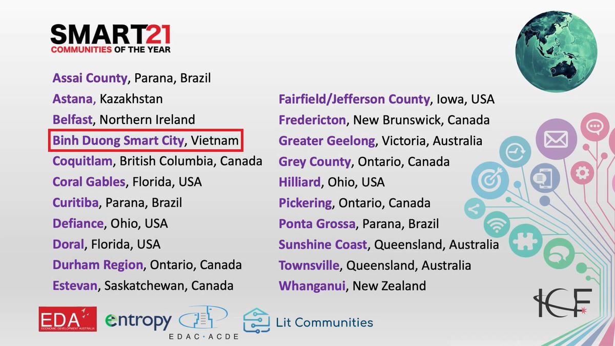 Với chiến lược đúng đắn và những bước phát triển kiên định, vững chắc của của mình, Bình Dương một lần nữa chính thức được Tổ chức ICF công nhận là Smart 21 năm 2023 cùng các thành phố của các quốc gia như Canada, Brazil, Australia, …