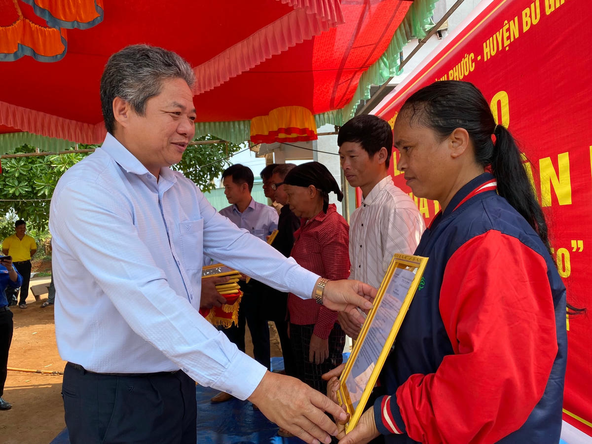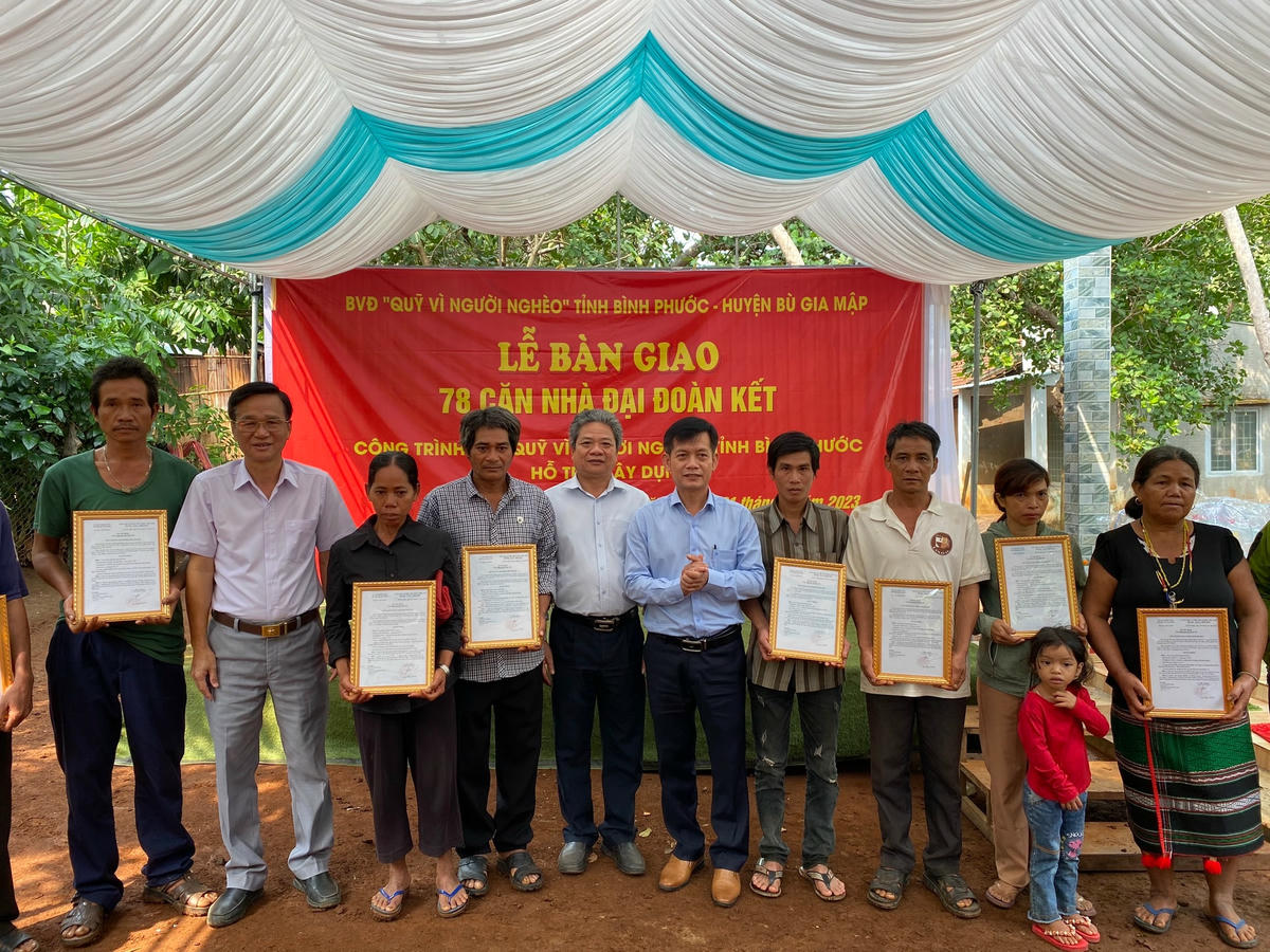 Tại buổi lễ, 78 hộ nghèo của xã Đăk Ơ và 49 hộ của xã Bù Gia Mập đã được trao quyết định sở hữu nhà do UBND huyện cấp, trong đó có 93 căn bàn giao cho hộ nghèo thuộc chương trình giảm 1.000 hộ dân tộc thiểu số của tỉnh, 34 căn thuộc chương trình giảm nghèo bền vững của huyện. Ngoài nguồn vốn hỗ trợ của quỹ Vì người nghèo tỉnh, có 32 hộ đối ứng thêm gần 1,3 tỷ đồng để xây dựng căn nhà thêm khang trang vững chắc.