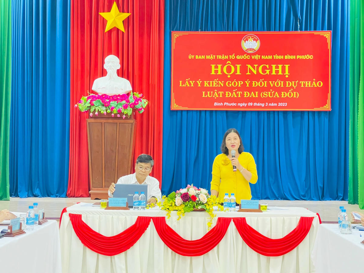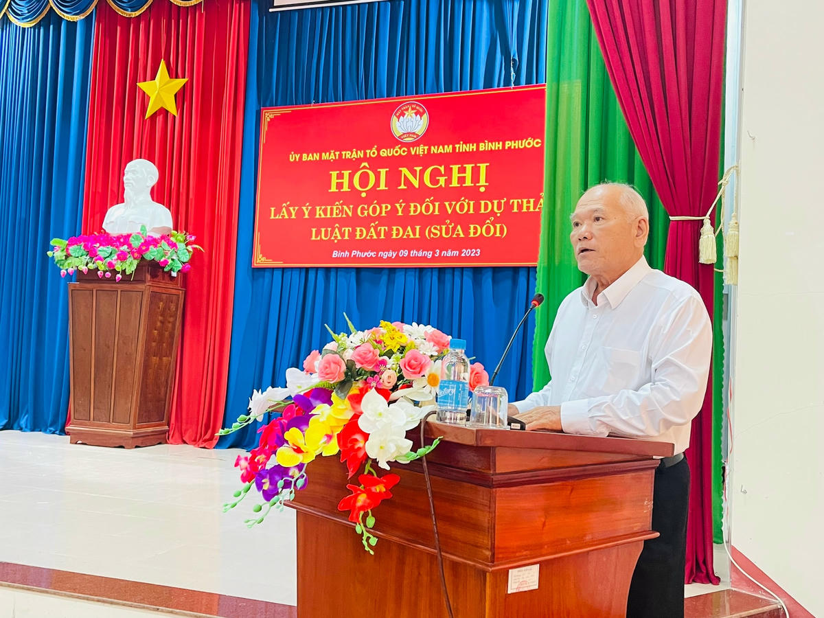 Đại diện Ủy ban MTTQ Việt Nam tỉnh Bình Phước đã nêu một số nội dung xoay quanh việc lấy ý kiến Dự thảo Luật Đất đai (sửa đổi), nhấn mạnh việc Dự thảo được cơ quan soạn thảo chuẩn bị kỹ lưỡng, khoa học, đúng định hướng trong Văn kiện Đại hội Đảng khóa XIII; Nghị quyết 18-NQ/TW ngày16/6/2022 của Ban Chấp hành Trung ương Đảng và các Nghị quyết, kết luận của Đảng, Quốc hội. Cụ thể, việc sửa đổi Luật Đất đai lần này đã khắc phục những tồn tại, hạn chế trước đây, phát huy nguồn lực đất đai, đáp ứng yêu cầu phát triển của đất nước trong giai đoạn mới, góp phần hoàn thiện hệ thống pháp luật về đất đai phù hợp với thể chế kinh tế thị trường định hướng xã hội chủ nghĩa; thiết lập hệ thống quản lý đất đai hiện đại, minh bạch, hiệu quả gắn với đẩy mạnh cải cách hành chính, chuyển đổi số, phát huy dân chủ, hạn chế khiếu kiện về đất đai.