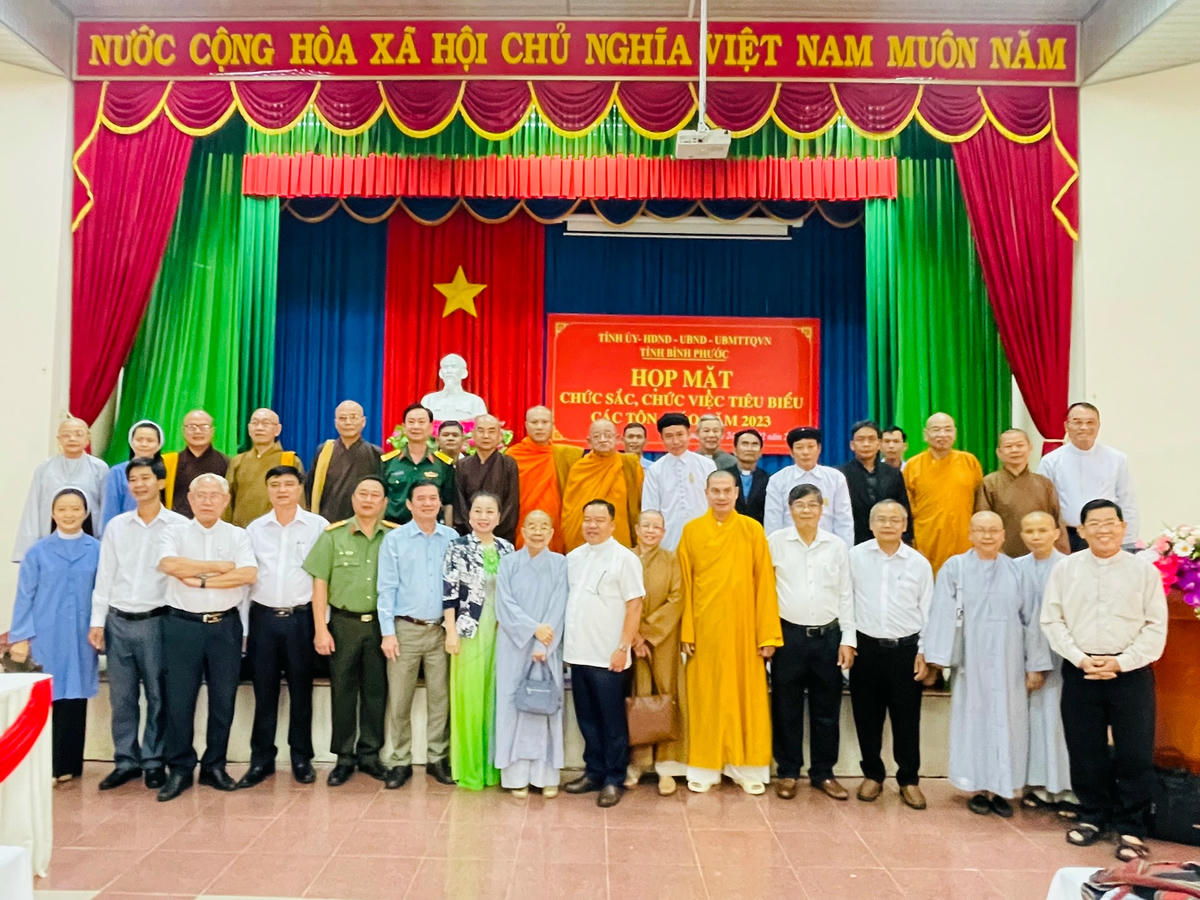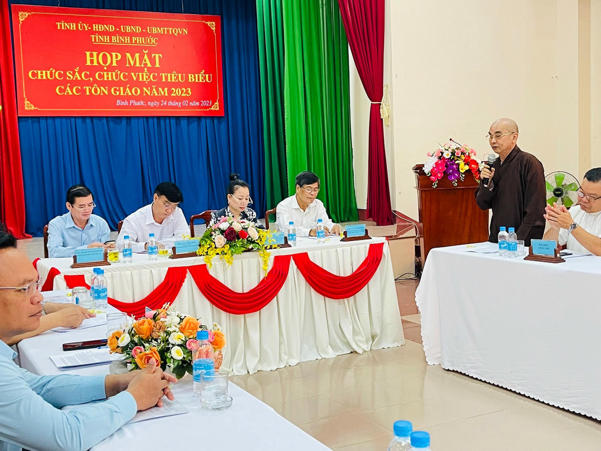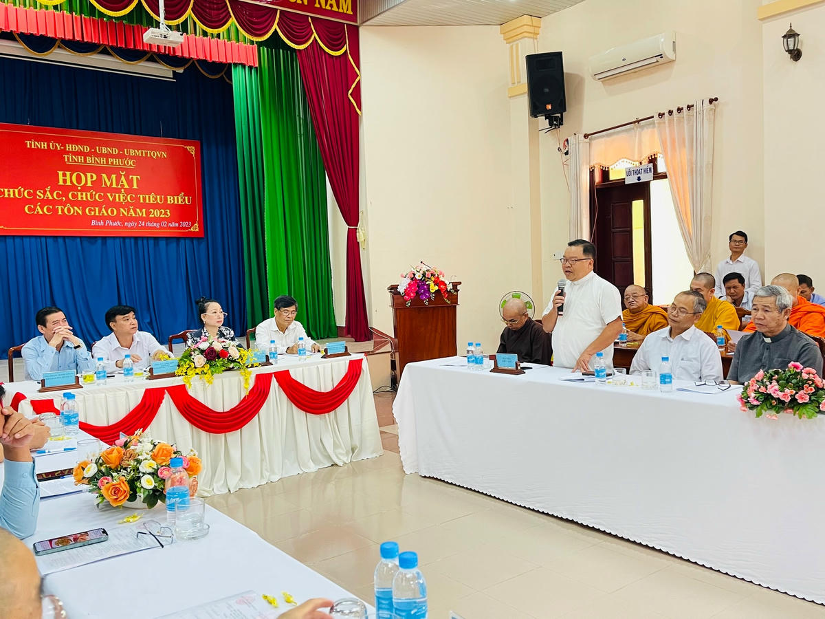 Tại buổi họp mặt, các đại biểu đã nghe báo cáo về hoạt động của các tổ chức tôn giáo trong năm 2022; thông báo tình hình thực hiện kế hoạch phát triển kinh tế-xã hội năm 2022 và nhiệm vụ năm 2023. Theo đó, trong năm 2022, nhiều sự kiện nổi bật của các tôn giáo trên địa bàn tỉnh Bình Phước đã được diễn ra như: tổ chức thành công Đại hội đại biểu Phật giáo tỉnh lần thứ VI, nhiệm kỳ 2022-2027; Đại hội đại biểu “Người Công giáo Việt Nam xây dựng và bảo vệ Tổ quốc” tỉnh lần thứ VI, nhiệm kỳ 2022-2027; Phối hợp tổ chức Lễ cầu siêu cho 133 Anh hùng liệt sĩ đã hy sinh vì độc lập, tự do của Tổ quốc; ...