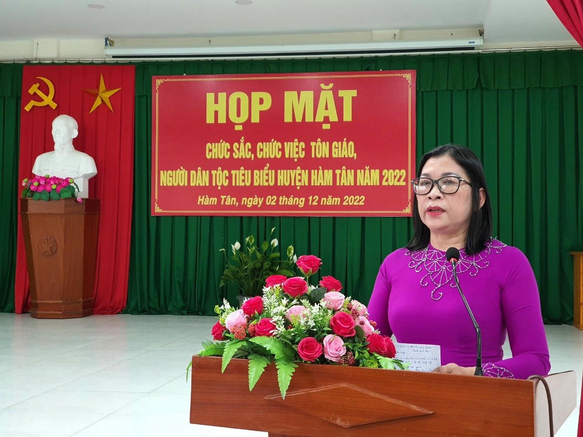 Phát biểu tại buổi găp mặt, bà Bố Thị Xuân Linh, Chủ tịch Ủy ban MTTQ Việt Nam tỉnh Bình Thuận, ghi nhận và biểu dương các vị chức sắc, chức việc các tôn gi, áo và người uy tín trong đồng bào dân tộc đã tích cực tham gia vận động bà con tín đồ thực hiện tốt các phong trào thi đua yêu nước, nhân đạo từ thiện tại địa phương trong thời gian qua.