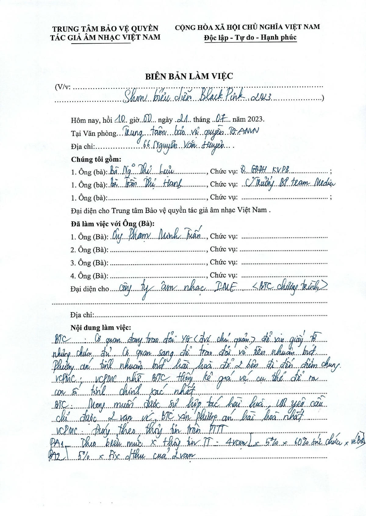 Trước đó, khi có thông tin nhóm Black Pink sẽ có chuyến lưu diễn ở Hà Nội, Việt Nam vào cuối tháng 7. VCPMC đã liên hệ với Công ty TNHH Âm nhạc IME để yêu cầu thực hiện xin phép và trả tiền bản quyền trước khi chương trình diễn ra theo quy định của pháp luật về quyền tác giả. Tuy nhiên, đến ngày 19/7/2023, công ty IME vẫn chưa thực hiện quyền tác giả. Ngày 21/7/2023 Cơ quan chức năng quản lý Nhà nước Việt Nam cũng đã có buổi làm việc ba bên nhằm giải quyết thỏa đáng những vấn đề tồn tại.
