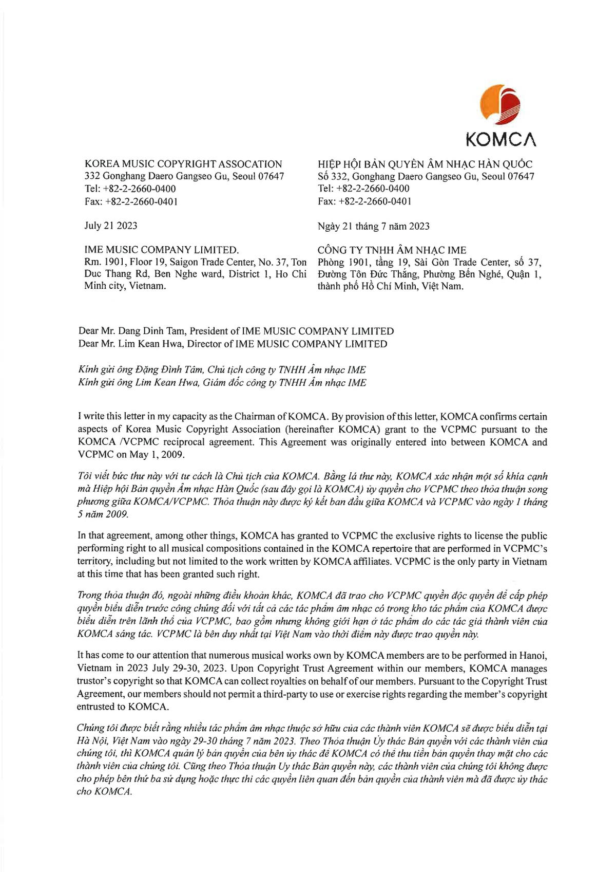 Trong thỏa thuận đó, ngoài những điều khoản khác, KOMCA trao cho VCPMC quyền độc quyền để cấp phép quyền biểu diễn trước công chúng đối với tất cả các tác phẩm âm nhạc có trong kho tác phẩm của KOMCA được biểu diễn trên lãnh thổ của VCPMC, bao gồm nhưng không giới hạn ở tác phẩm do các tác giả thành viên của KOMCA sáng tác. VCPMC là bên duy nhất tại Việt Nam vào thời điểm được trao quyền này. Chúng tôi được biết rằng nhiều tác phẩm âm nhạc thuộc sỏ hữu của các thành viên KOMCA sẽ được biểu diễn tại Hà Nội, Việt Nam vào ngày 29 và 30/7/2023. Theo thỏa thuận Ủy thác Bản quyền đối với các thành viên của chúng tôi, thì KOMCA quản lý bản quyền bên ủy thác để KOMCA có thể thu tiền bản quyền thay mặt cho các thành viên của chúng tôi. Cũng theo thỏa thuận Ủy thác bản quyền này, các thành viên của chúng tôi không được cho phép bên thứ ba sử dụng hoặc thực thi các quyền liên quan đến bản quyền của thành viên mà đã được ủy thác cho KOMCA.